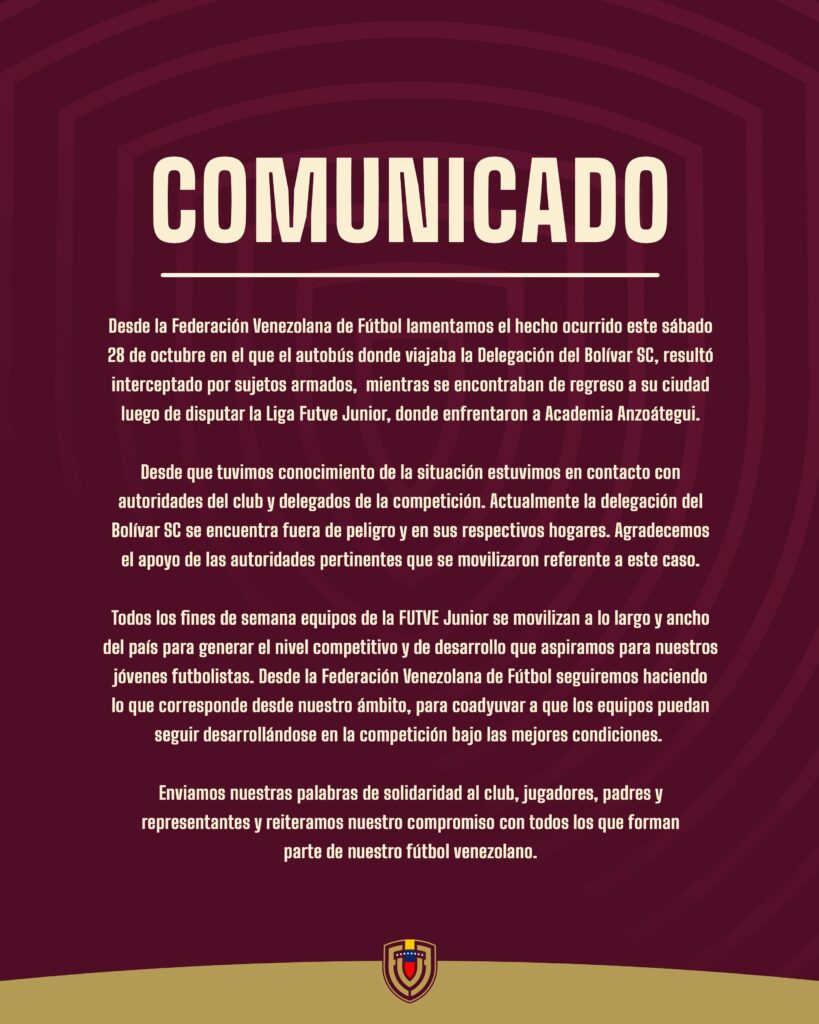 Tras el secuestro y robo a mano armada del autobús donde viajaban futbolistas de la categoría junior, pertenecientes a la delegación del Bolívar SC, La Federación Venezolana de Futbol (FVF) emitió un comunicado para lamentar y rechazar lo ocurrido, enviando palabras de solidaridad a los afectados y sus respectivos padres o representantes.