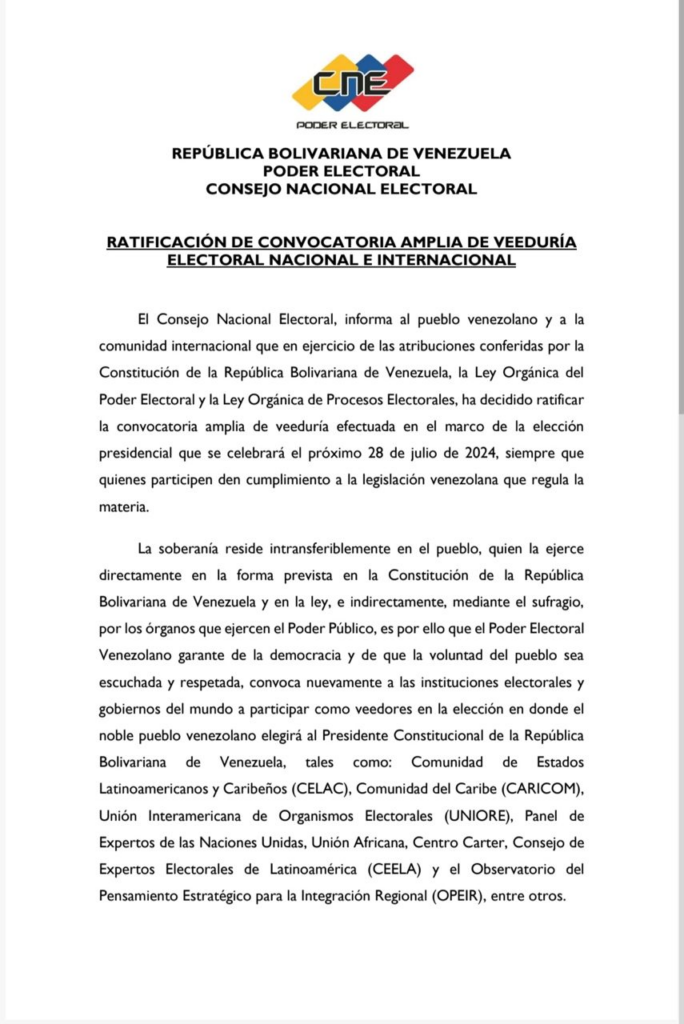 El presidente del Consejo Nacional Electoral (CNE) Elvis Amoroso, informó que fue revocada la invitación como veedores internacionales a la Unión Europea, en las elecciones presidenciales del próximo 28 de julio.