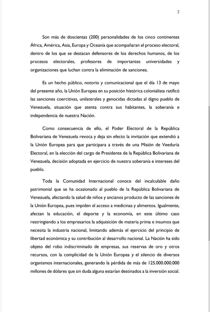 Por lo que informó que “ Como consecuencia de ello, el Poder Electoral de la República Bolivariana de Venezuela revoca y deja sin efecto la invitación que extendió a la Unión Europea para que participara a través de una Misión de Veeduría Electoral, en la elección del cargo de Presidente de la República Bolivariana de Venezuela, decisión adoptada en ejercicio de nuestra soberanía e intereses del pueblo”.