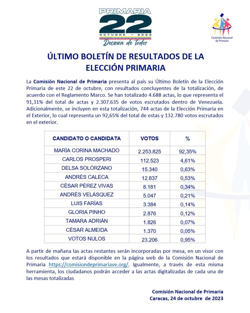 Desde el primero boletín emitido por la Comisión, la madrugada del lunes 23, Machado se perfilaba como la victoriosa del proceso ordenado por la Plataforma Unitaria para escoger al candidato que los representará en las elecciones presidenciales de 2024, previstas para el segundo semestre de ese año.