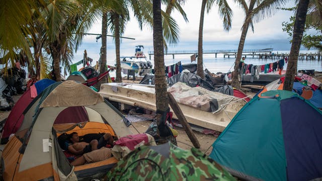Los días pasan sin que su situación mejore. Sus hijos de 9, 8 y 5 años constantemente se enferman de vómito, diarrea y gripe al vivir a la intemperie en carpas plásticas en las playas de Necoclí, un pueblo costero de Colombia cercano a la selva del Darién -la frontera natural entre Colombia y Panamá- al que llegaron hace dos meses y del que, por ahora, ven poco posible salir.