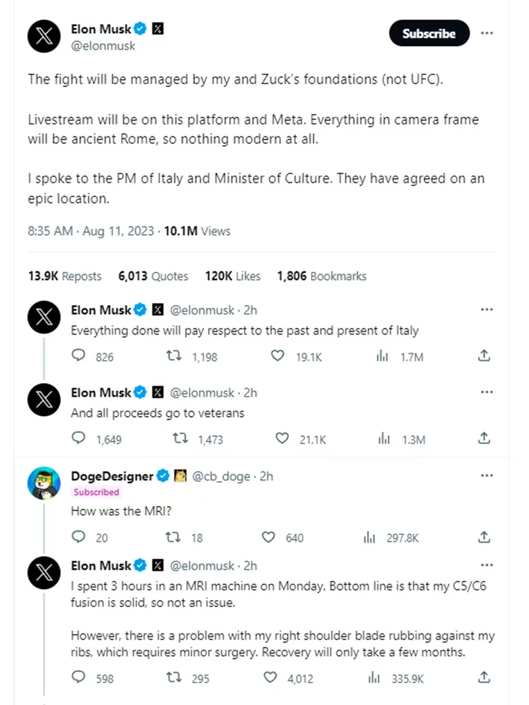 En junio, los dos multimillonarios -enfrentados por el liderazgo en el mundo digital- acordaron pelear a través de una serie de publicaciones en las redes sociales de sus respectivas plataformas e incluso Musk llegó a mencionar que esta pelea se podría dar en Las Vegas o en el Coliseo de Roma.